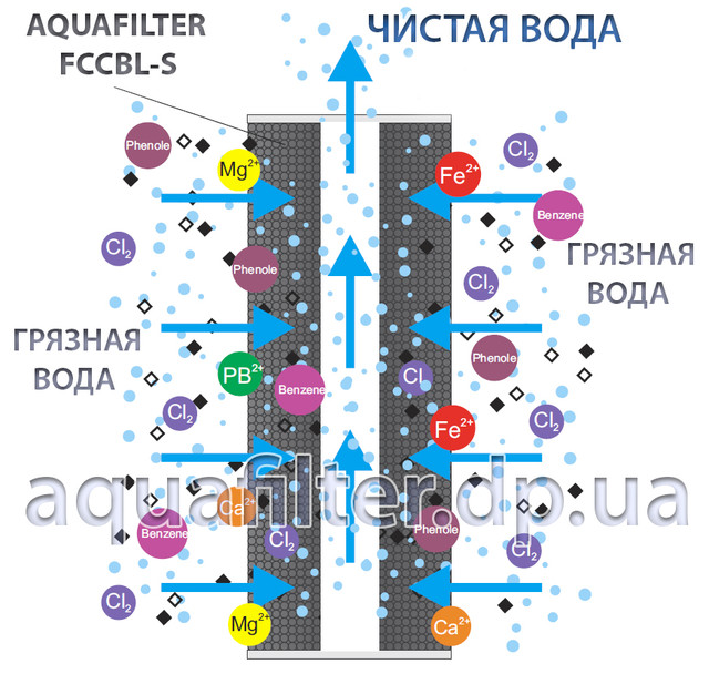 У момент проливання води крізь картридж із пресованого вугілля, вона не тільки очищається від шкідливих органічних речовин, хлору тощо, але й доочищається від механічних домішок, адже такі картриджі завдяки технології "карбонблок" мають свою щільність (5 або 10 мкм у середньому), що не дає цим домішкам пройти крізь пори.